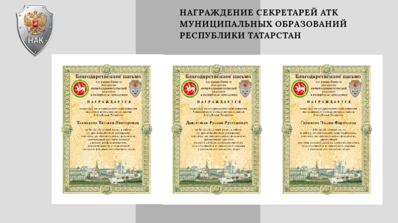 За деятельный личный вклад в работу по противодействию терроризму, проявленные при этом настойчивость, инициативу и творческий подход принято решение о награждении грамотами АТК в Республике Татарстан: